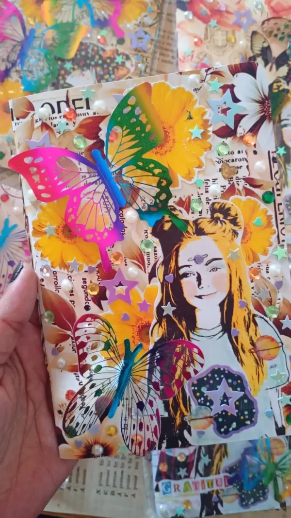 Journal realizado con hojas reutilizadas con tapita intervenida con collage y muchos brillos, ideal para tu diario de amor propio o de gratitud. Medidas 12x17 aprox. Tienen entre 30 y 40 páginas. Los diseños de envían sin elección.